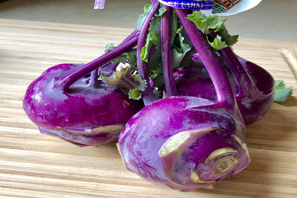 Sie finden Kohlrabi in den frühen Frühlings- und Sommermonaten und im Herbst. Es gibt mehrere verschiedene Sorten, wobei man bei uns meist die hellgrüne Version sieht. Mein Favorit ist die violette Sorte. Wenn man die harte Außenhaut abzieht, ist der Kohlrabi unabhängig von der Außenschale weiß.